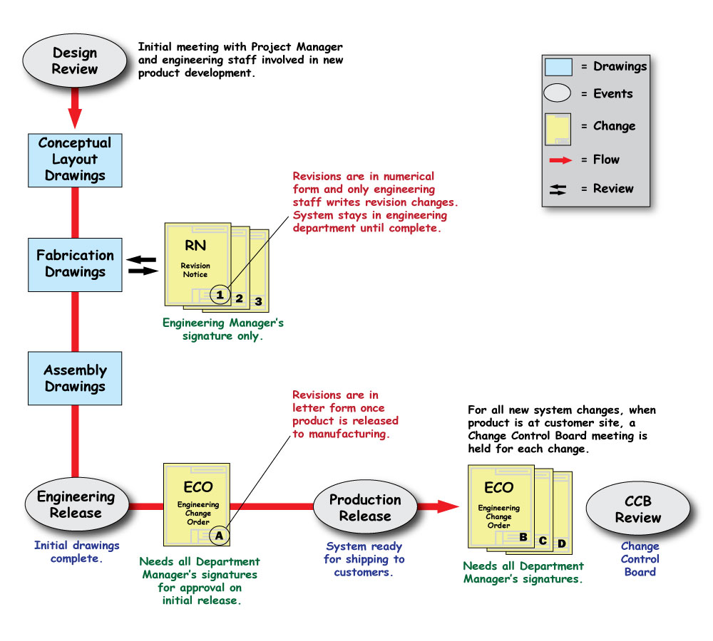 As a document control manager it was my responsibility to make sure engineering documentation flowed smoothly and identify any descrepancies during the Design Process. I would administrate meetings for Design Reviews, Engineering Release, and final Production Release. I would upload all Revision Notices (RN), Engineering Change Orders (ECO), and completed drawings when completed, to the engineering department's drawing vault for future reference. I would develop drawing formats, RN and ECO formats, and any documentation that needs to be used by the engineering department.
