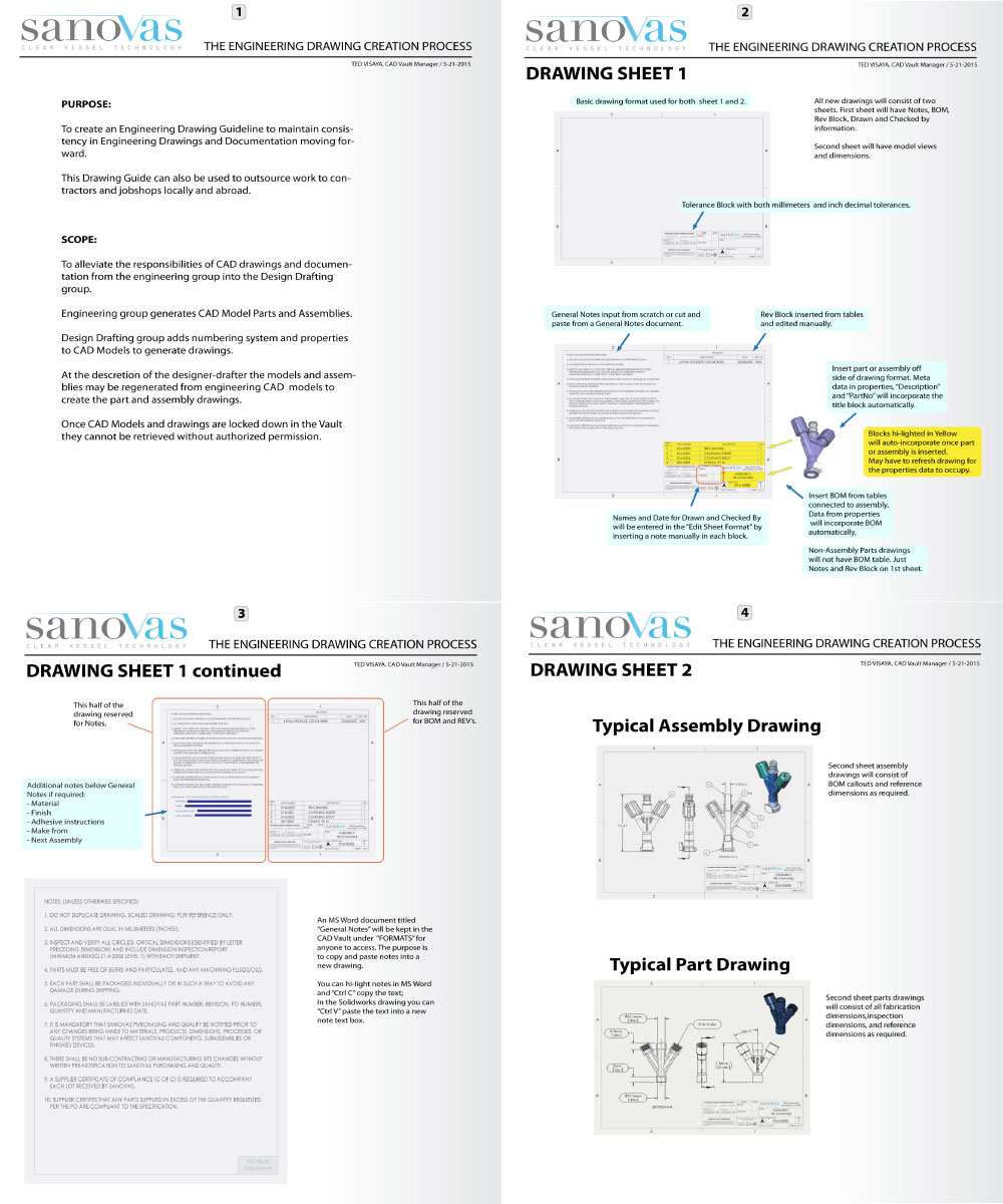 My responsibilities as the acting document control manager at many companies was to create or update the engineering drawing manual. I would write procedures and create drawing formats that catered to the engineering CAD programs, Solidworks, Autodesk Inventor, and Autocad. The example below is an example of an engineering drawing creation process I developed.