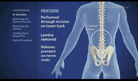 A laminectomy is a surgical procedure in which doctors remove part of the spine called the lamina to treat problem areas, such as the L3, L4, and L5 disks in my lower back. The removed bones look like the ones shown in the animated GIF to the right.
