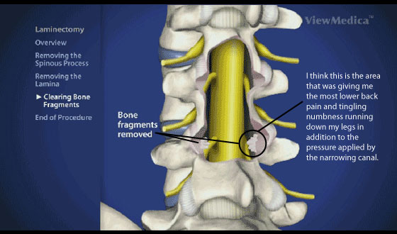 After complaining about it for some time to my doctor, I was finally referred to a spine specialist who looked at my x-rays and determined I had spinal stenosis, where there was pressure to the nerves in my lower back. Spinal decompression was necessary in a surgical procedure called a LAMINECTOMY.