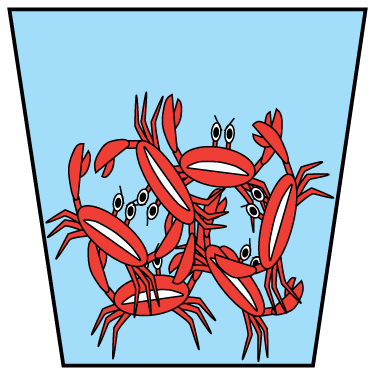 Stuck in the cold wet bucket the three crabs kept pushing each other around to get to the top position. The bottom crab was the most irritated cause the other two were on top of him competing for higher ground. As the other two were about to reach the top the bottom one knew that if they got out he wouldn’t have anyone to step on for him to reach the top so he took his big claws and pulled both of them down. So no crabs got out.
